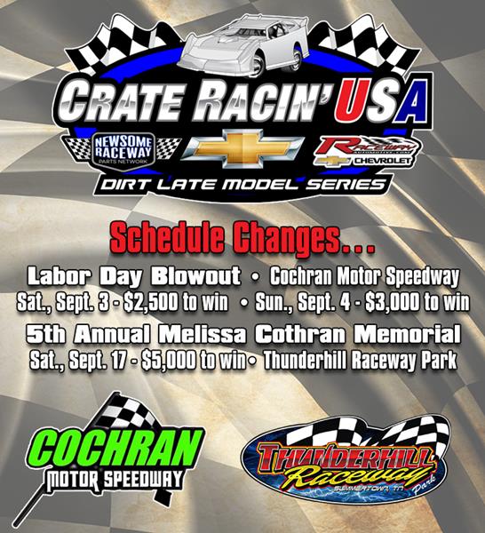 Two weekends at the Chris and Joni Martin-promoted Cochran (Ga.) Motor Speedway have been added to the schedule, while the annual King of the Hill at Thunderhill Raceway Park in Summertown, Tenn., is now slated Saturday Sept. 17, as part of the already-scheduled Melissa Cothran Memorial at the steeply-banked facility.