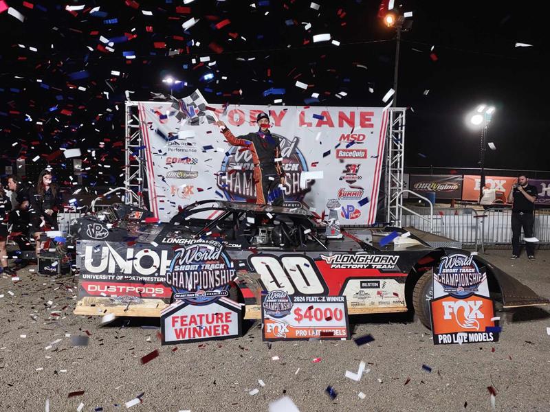 (Concord, NC - November 2nd, 2024) - John Ruggiero Jr. has claimed his second Short Track World Championship, leading the final 24 laps of the main event on Saturday night at the Dirt Track at Charlotte. Ruggiero Jr.’s victory marks him as one of the elite competitors in the event’s history, joining the ranks of only two other drivers to win the championship multiple times.