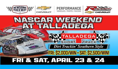 ADAIRSVILLE, Ga. — After two successive weather-related postponements of the annual Rumble on the Gumbo at Greenville (Miss.) Speedway, there’s a new season-opening weekend in town for the Newsome Raceway Parts-sponsored Crate Racin’ USA Dirt Late Model Series. It will be a weekend doubleheader, and take place in Eastaboga, Ala., as third-mile Talladega Short Track prepares to host three different Crate Racin’ USA divisions April 23-24 as part of its annual NASCAR weekend.