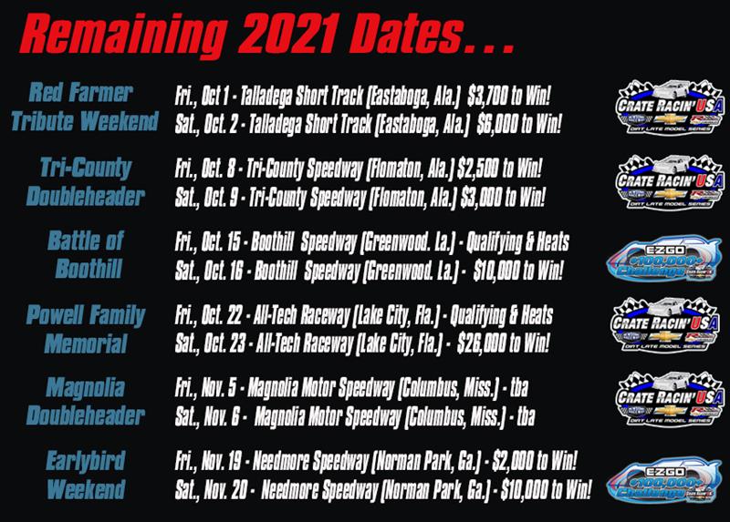 Several other changes have been made to the schedule, including a date change for the previously-scheduled appearance at Boothill Speedway in Greenwood, La. The inaugural Battle at Boothill was postponed earlier this season due to potential gas shortages when the Colonial Pipeline was knocked offline, and that $10,000-to-win race will now be held at the track Oct. 14-16.